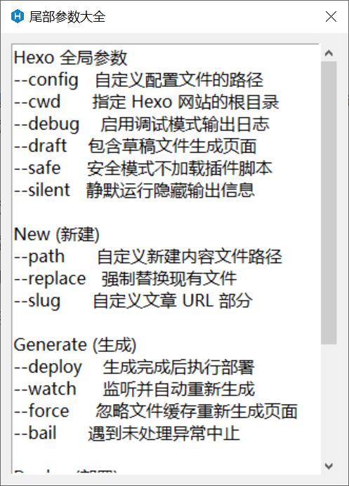 为了方便使用,我在软件内内置了Hexo参数大全,省的打,直接点一下尾部参数输入框后的信息按钮就会弹出尾部参数大全窗口,直接复制使用,这里再次列出以供复制