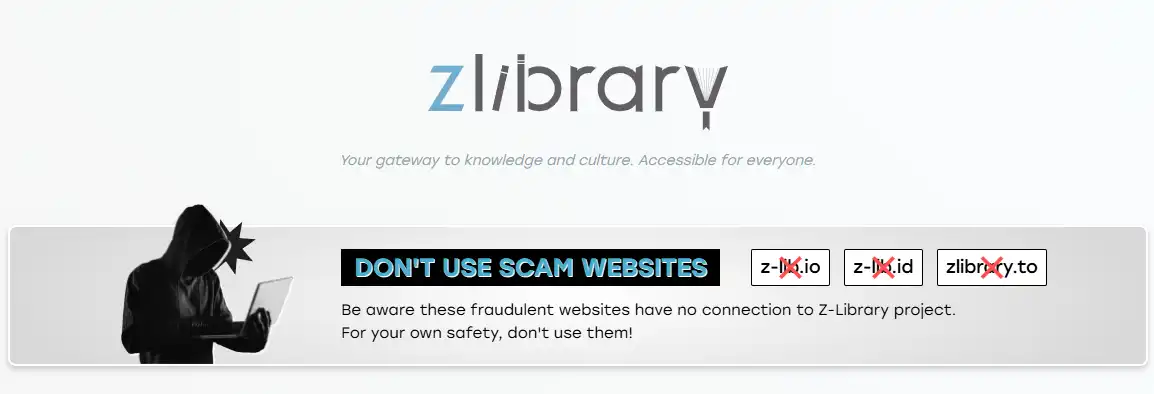 以下为一些无耻的模仿Z-library的诈骗网站,它们模仿Z-library的页面, 利用人们对自由知识的渴望敛财,并且在背后攻击真正的Z-library